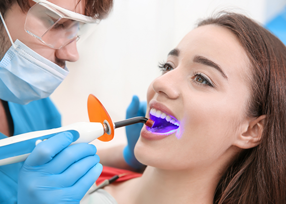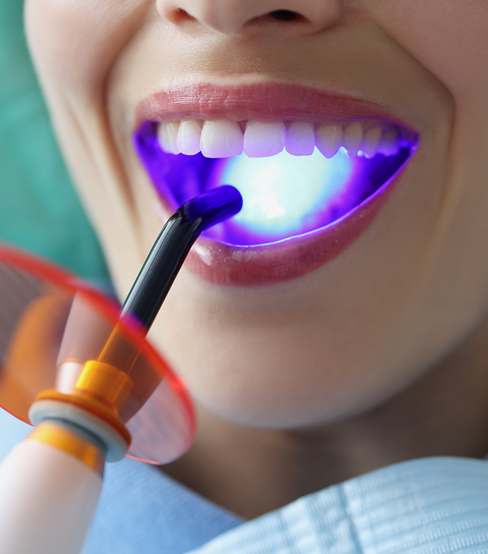 A very mild etching solution is applied to your teeth to create very small crevices in the tooth's enamel structure. This provides a slightly rough surface, permitting a composite-filled resin to bond to your tooth with an adhesive. Once placed, a high-intensity laser cures the resins onto your tooth’s surface. Each individual layer of resin hardens in less than a minute. When the layer has been applied, the bonded material is then sculpted and finely polished.